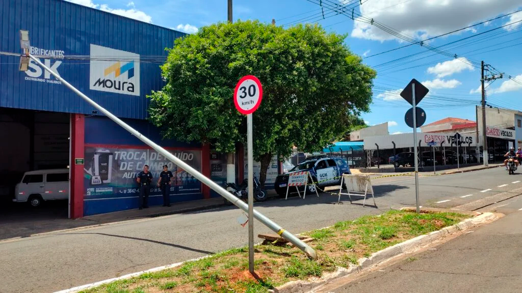 Um caminhão que prestava serviço em uma obra do supermercado Proença colidiu contra um poste de iluminação pública no canteiro central da Avenida Doutor Arthur Cordeiro, no bairro Silvares, em Birigui, na
