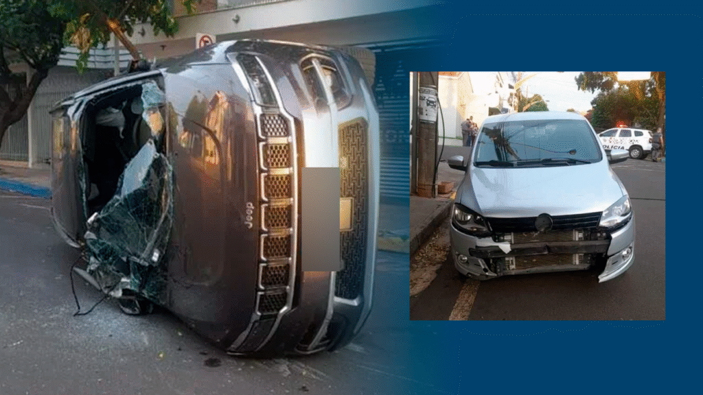 Acidente entre Fox e Jeep Commander provoca capotamento no centro de Birigui