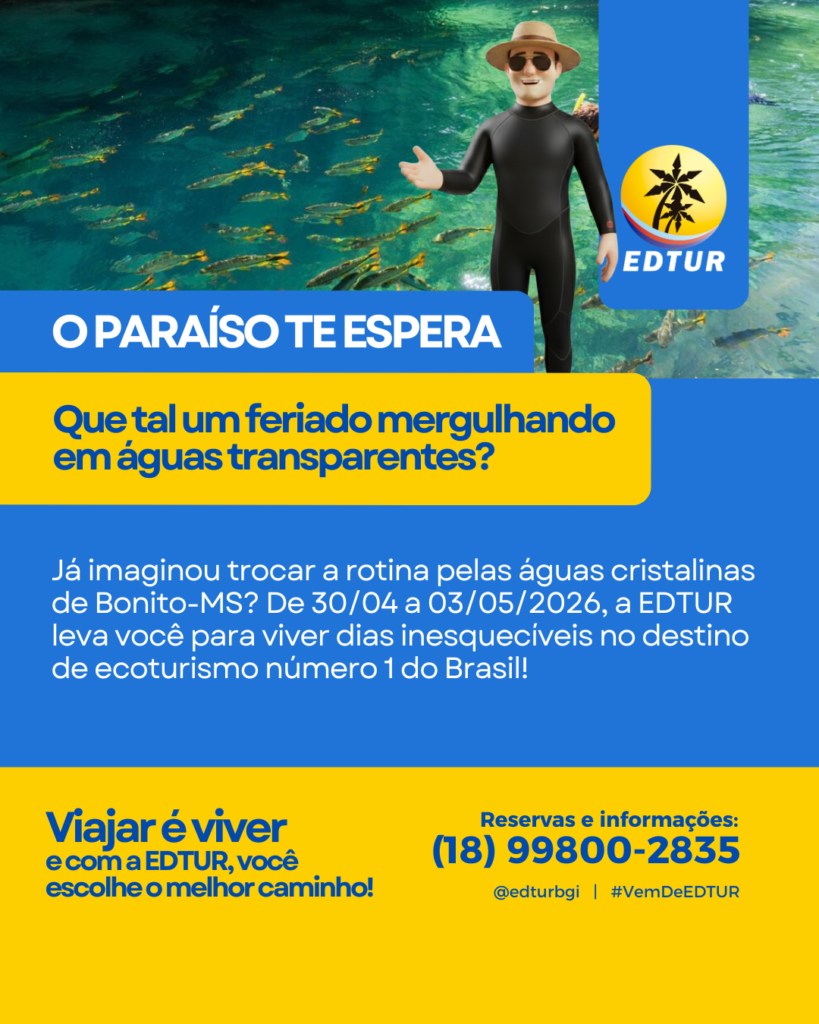 A Edtur, agência com forte atuação no interior paulista, destaca-se pela expertise em conectar o público de Birigui e região aos melhores receptivos de Bonito. Com um atendimento personalizado, a agência organiza desde a malha aérea — que conta com voos diretos para o aeroporto regional — até a logística de transporte entre as fazendas, garantindo que o viajante foque apenas na contemplação.