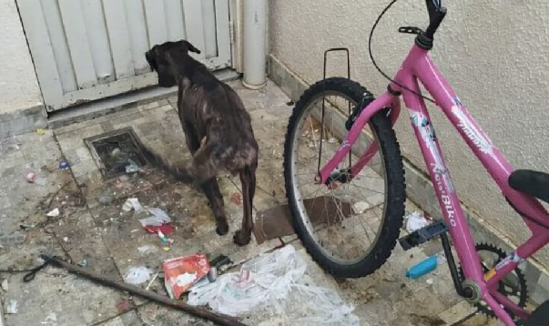 A equipe foi acionada por um vizinho, que informou que um casal havia se mudado do imóvel recentemente, deixando o animal para trás, sem água e sem alimentação.