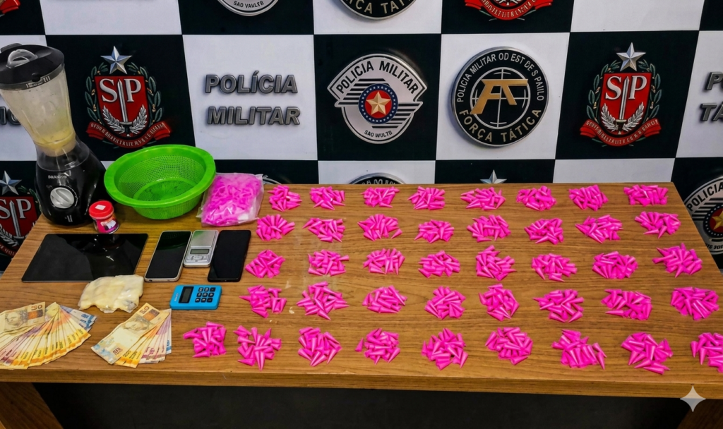 Durante a vistoria, os policiais localizaram uma grande quantidade de entorpecentes e materiais usados no tráfico. Ao todo, foram apreendidos 810 pinos com cocaína, além de dezenas de recipientes vazios, um liquidificador com vestígios da droga, balança de precisão, máquina de cartão, celulares, tablet e R$ 609 em dinheiro.