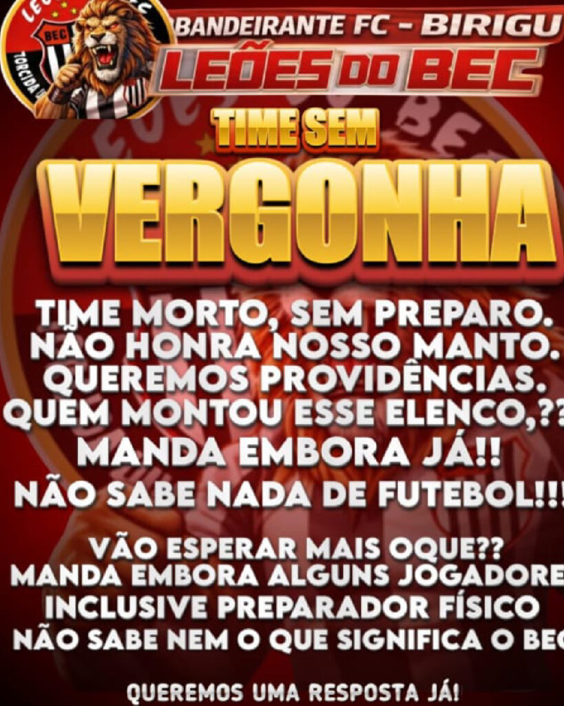 😡😠 “A torcida sempre fez a parte dela. Agora queremos ver atitude, entrega e respeito. O Bandeirante tem história e camisa pesada. Quem veste esse manto precisa entender o que ele representa”, afirmou.