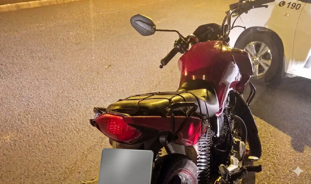 Segundo a PM, a equipe avistou uma motocicleta Honda CG 160 Fan e, ao notar a viatura, o condutor acelerou e levantou a placa, iniciando a fuga. Após cerco policial, o motociclista perdeu o controle em uma curva e caiu, sendo abordado.
