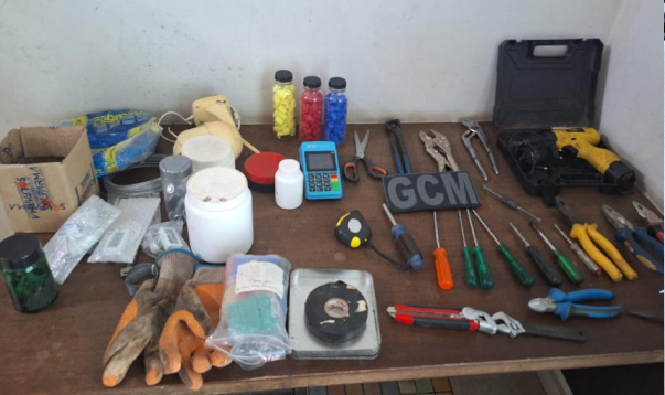 Durante a vistoria, os agentes localizaram diversos objetos sem comprovação de origem, entre eles ferramentas, cabos elétricos, equipamentos e até uma câmera de segurança — itens que podem estar ligados a furtos recentes na região.
