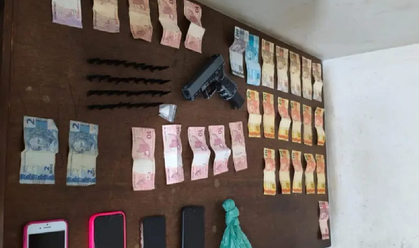 No interior do carro estavam o condutor, um passageiro de 23 anos e cinco adolescentes. Durante a abordagem, os policiais localizaram R$ 830 em dinheiro com o motorista. Em vistoria no veículo, foram encontrados 33 pinos de cocaína sob o banco do condutor e um simulacro de pistola sob o banco do passageiro.
