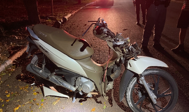 Com o impacto, a motocicleta ficou completamente danificada, evidenciando a gravidade da colisão.